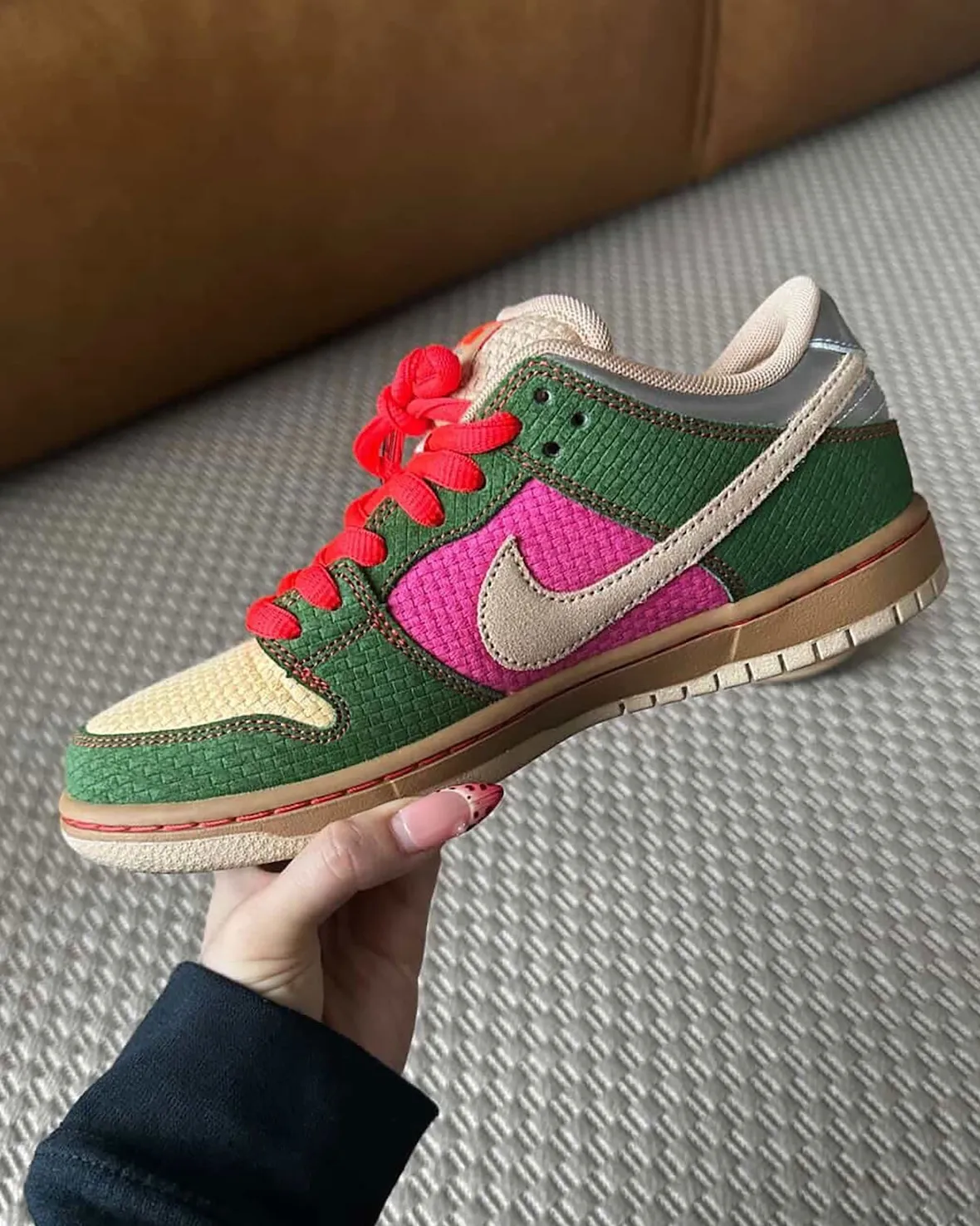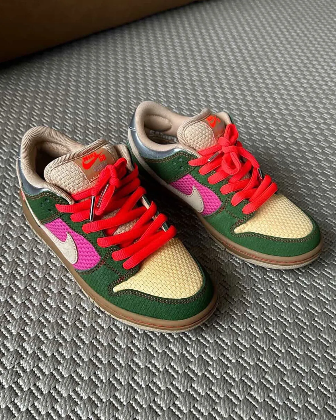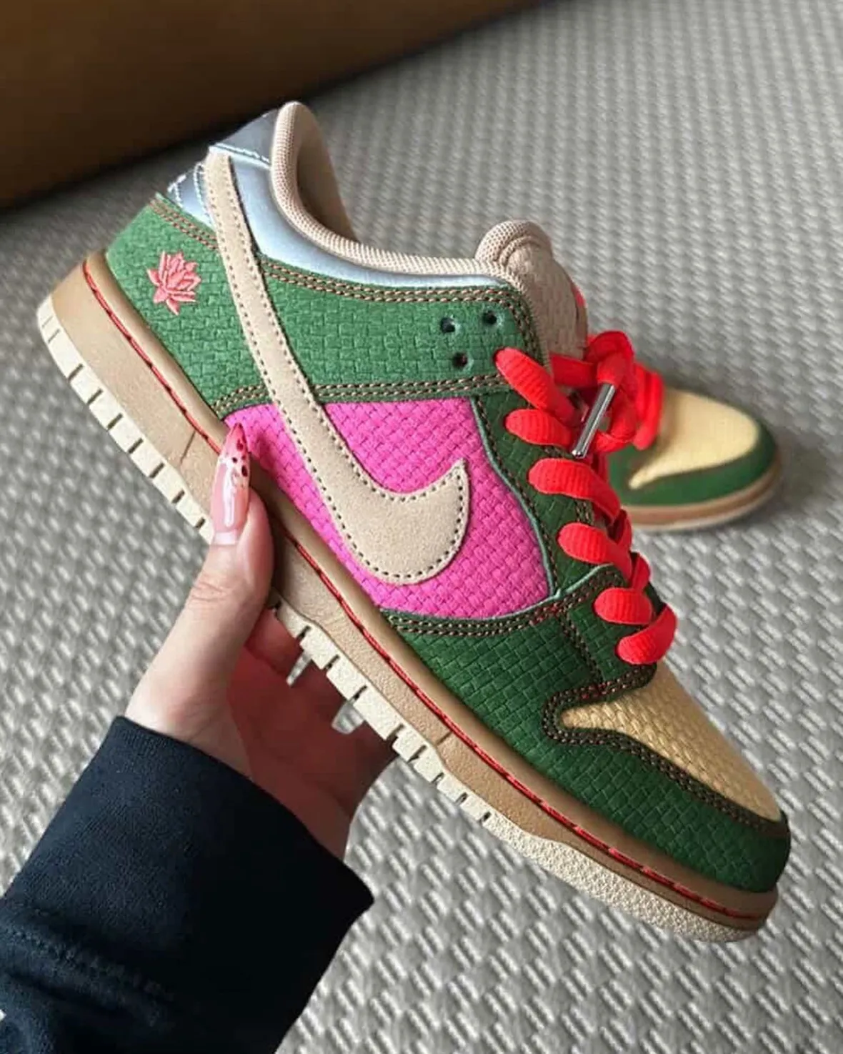 나이키의 SB 덩크 로우 ‘Songkran’ 프렌즈 & 패밀리(F&F) 에디션이 공개되며, 기존 콘셉트를 한층 더 확장한 버전이 등장했습니다. 이번 모델은 태국 설날 축제 ‘송크란’을 기반으로 한 스토리를 유지하면서도, 보다 강한 색감과 텍스처를 통해 한층 실험적인 방향으로 전개됩니다. 어퍼에는 그린 컬러의 우븐 스타일 오버레이가 적용되고, 핑크 사이드 패널과 대나무 톤 토박스가 조화를 이루며 생동감 있는 컬러 구성을 완성합니다.